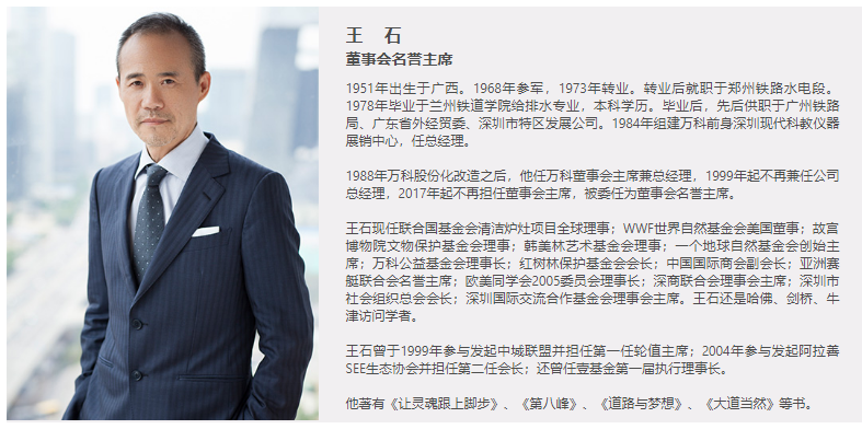 资料显示,王石1951年出生于广西,1988年起担任万科董事会主席兼总经理,2017年卸任,被委任为董事会名誉主席。2003年,52岁的王石登顶珠峰,成为彼时年龄最大的登顶者。更有趣的是,由于在万科持股很少,王石从未登上福布斯、胡润富豪榜,身家两亿左右。