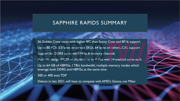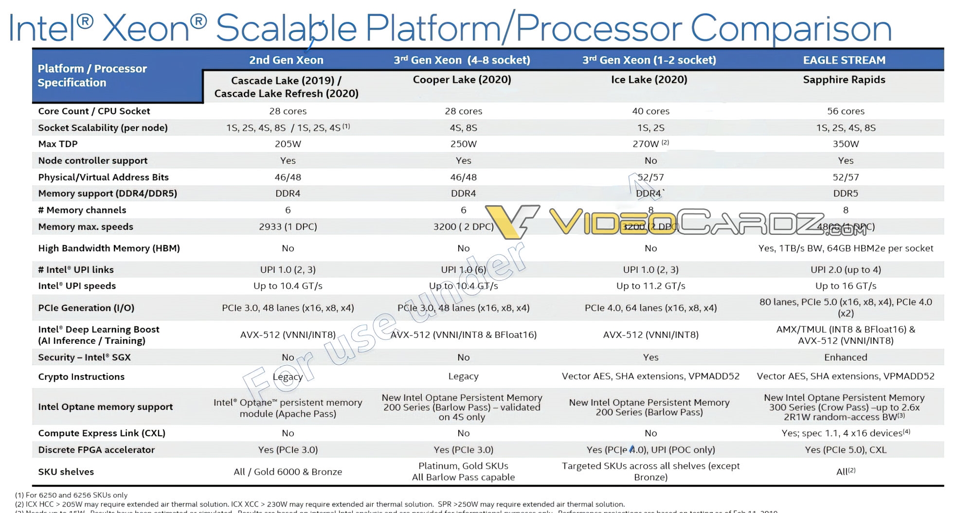 Sapphire Rapids将重新统一单路到八路市场,使用10nm SuperFin增强型工艺制造,最多56核心112线程(据说物理芯片其实60个核心但至少初期无法全部开启),热设计功耗上限从270W提高到350W(据说还能解锁400W)。
