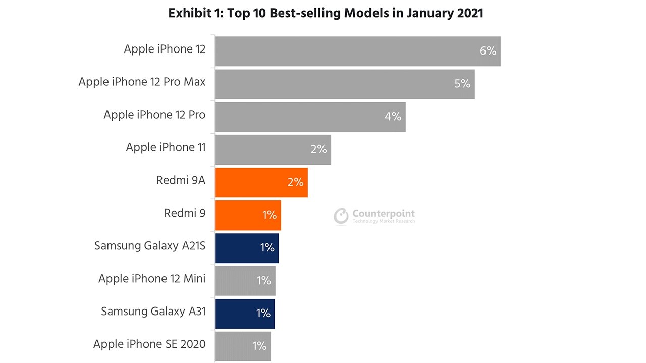 iPhone 12是1月份全球最畅销的智能手机,并且苹果抢占了排行榜前十名中的六个位置。根据Counterpoint Research的数据,iPhone 12毫无疑问领跑,其次是iPhone 12 Pro和iPhone 12 Pro Max。这三款手机合计占据了苹果月销量的71%。