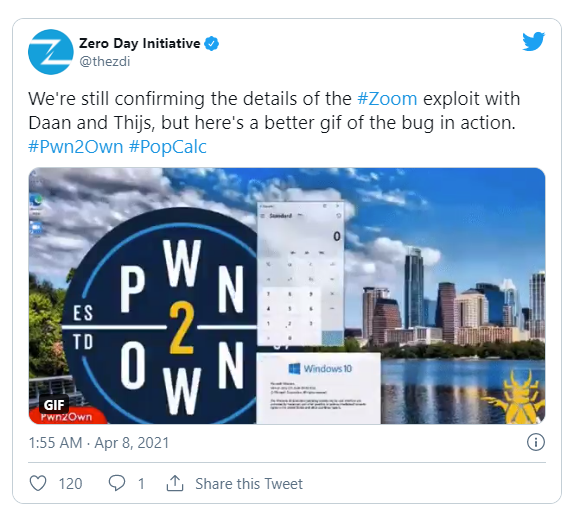Pwn2Own组织在推特上发布了一张gif图,展示了该漏洞的运行情况。你可以看到攻击者在运行Zoom的系统上打开计算器。Calc.exe经常被用作黑客在远程系统上打开的程序,以表明他们可以在受影响的机器上运行代码。