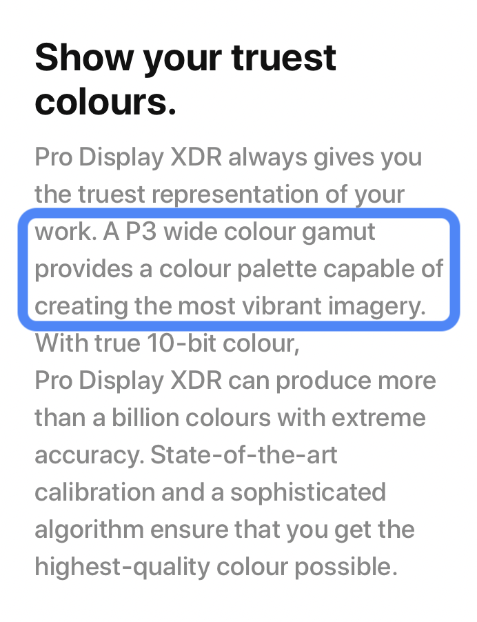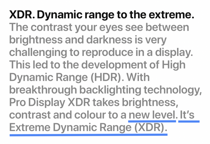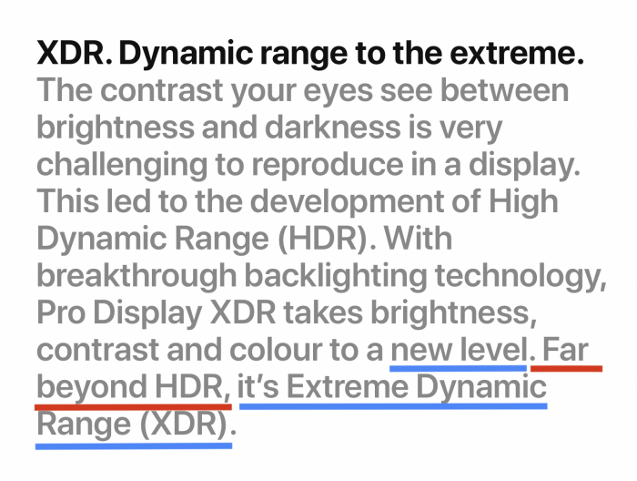最近,苹果为Pro Display XDR所做的营销受到了英国广告标准局审查。在研究了几起投诉后,该机构要求苹果放弃 "远超HDR "的说法,澄清其P3宽色域,还对显示器1000000:1的对比度提出质疑。现在,苹果已经更新了英国官网的相关文字。