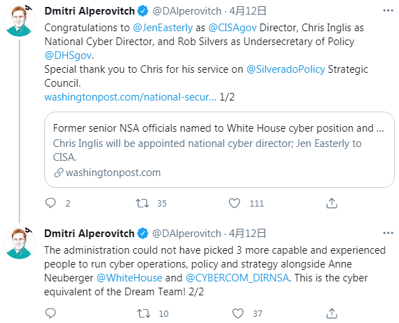 此外拜登任命了前国家安全局副局长 John“Chris”Inglis 为国家网络总监,这个新职务由国会在去年年底时设立,旨在监督和负责民政与国防机构的网络安全和相关预算。