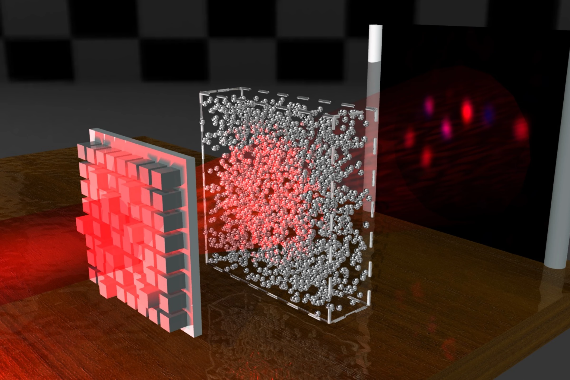 第一步要做的是了解你的敌人,于是研究团队用了一种非常特殊的光信号穿过粉末,然后测量它们如何击中探测器。通过一些复杂的数学方法可以确定散射的模式--并且可以设计出一种不会改变波的形状的特定光波。唯一的变化是稍微变暗了一点。