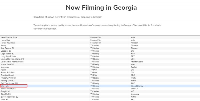 据外媒Comicbook报道,美国佐治亚州官方网站公布了目前在佐治亚州拍摄的电视剧集或电影,官方信息显示漫威电影公司剧集《女浩克》现已在美国佐治亚州开拍。
