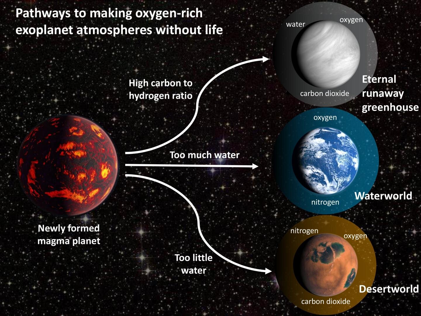 “如果你为地球运行模型,用我们认为是最初的挥发物清单,你可靠地得到同样的结果,每一次--没有生命,你不会在大气中得到氧气,”Krissansen-Totton解释说。“但我们也发现了多种情况,在没有生命的情况下,你可以得到氧气。”