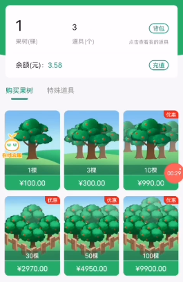 “阳光果园”的规则很简单,用户下载App后即可购买果树。果树的使用期限为一年,一颗普通果树的售价为100元,每天可收取3公斤果实,每公斤果实可卖出1.5元。不同果树的产量也有所不同,投资越高产量越大。300元一棵的金果树日产量为10公斤,388元一棵的钻果树日产量为15公斤。