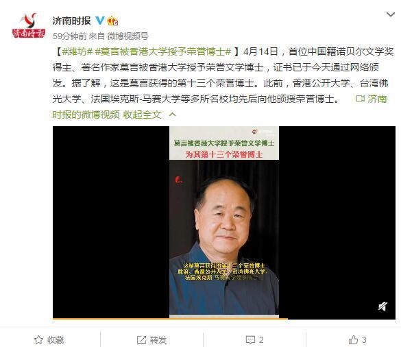 4月14日,首位中国籍诺贝尔文学奖得主、著名作家莫言被香港大学授予荣誉文学博士,证书已于今天通过网络颁发。据了解,这是莫言获得的第十三个荣誉博士。此前,香港公开大学、台湾佛光大学、法国埃克斯-马赛大学等多所名校均先后向他颁授荣誉博士。