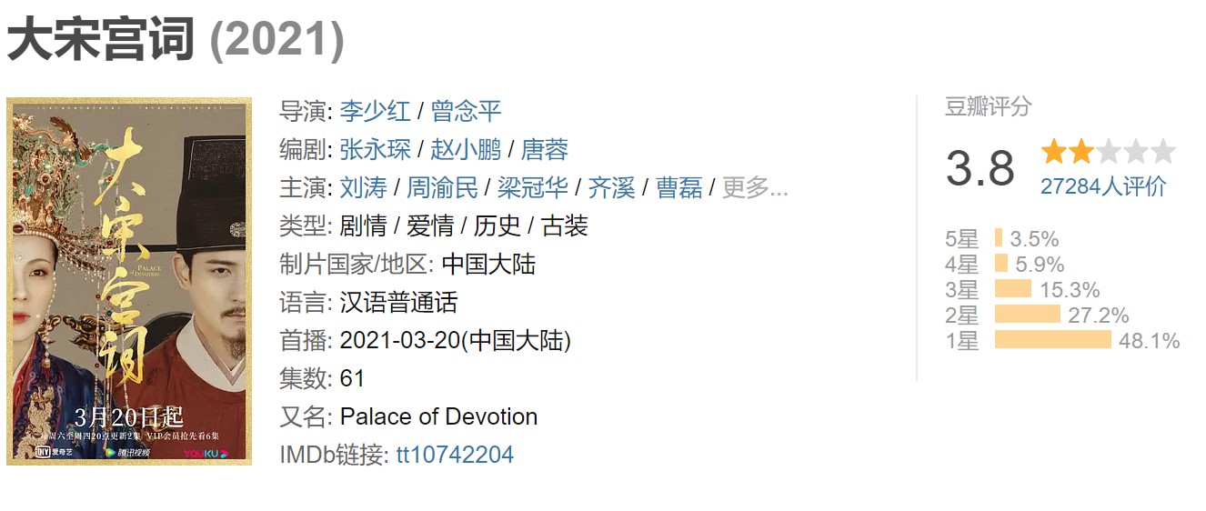 目前,《大宋宫词》的豆瓣评分仅为3.8。
