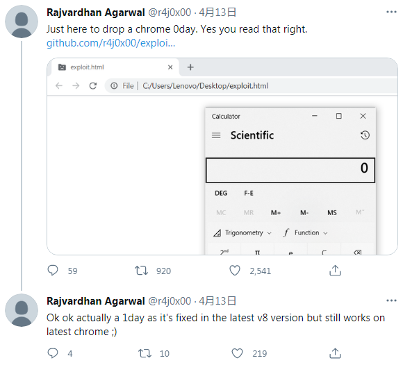 然后通过重现 Pwn2Own 比赛上的漏洞利用,Agarwal 在早些时候将概念验证代码上传到了 GitHub,并在 Twitter 上进行了分享。