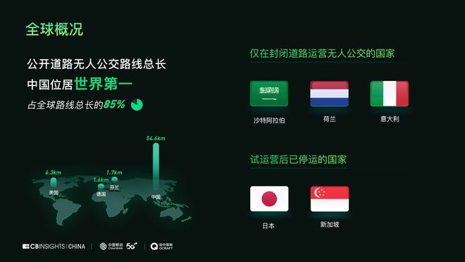 据《报告》指出,目前已有中国、美国、芬兰、德国四个国家部署了在公开道路运营的无人公交。其中,中国公开道路无人公交的路线总长位居世界第一,是排名第二的美国的8.6倍。数据显示,目前中国公开道路在运营的无人公交路线总长为54.6公里,约占全球路线总长的85%。
