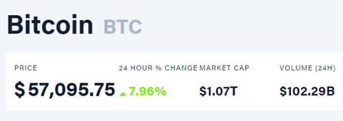 加密货币网站coindesk上的信息显示,比特币的价格目前为每枚57095.75美元,最近24小时上涨7.96%,市值为1.07万亿美元。