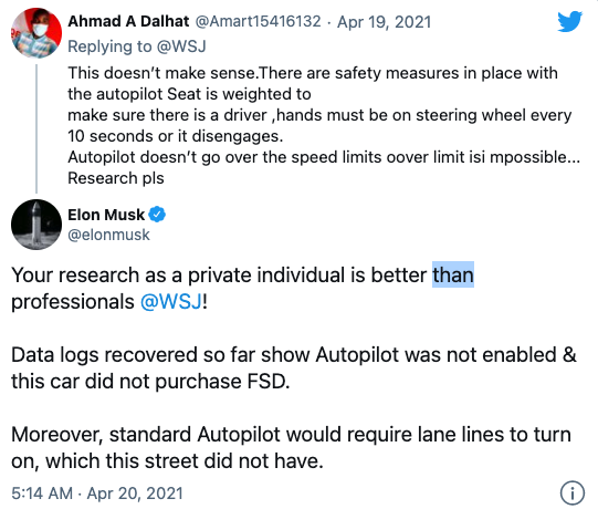 特斯拉CEO埃隆·马斯克(Elon Musk)周一发布推文称,特斯拉下载的初步数据显示,这辆车当时并未开启自动辅助驾驶系统Autopilot,它并不属于特斯拉的全自动驾驶系统(FSD)。