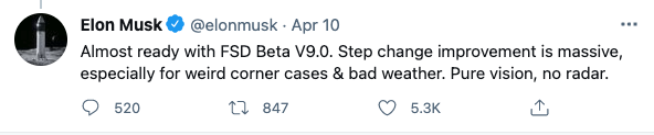 事故和调查并未放缓马斯克宣传特斯拉汽车能够自主驾驶的努力。他在最新一条推文中称:“FSD Beta V9.0几乎准备就绪,改善显著,尤其是在怪异的极端情况和恶劣天气条件下。完全是视觉技术,没有雷达。”