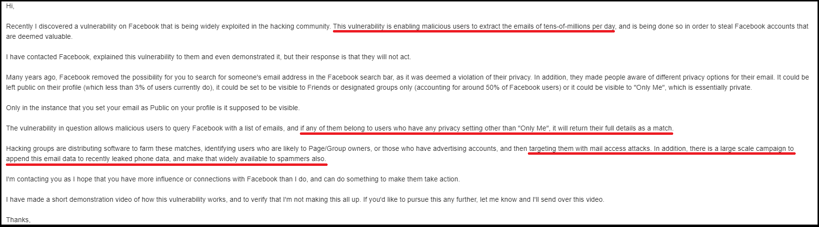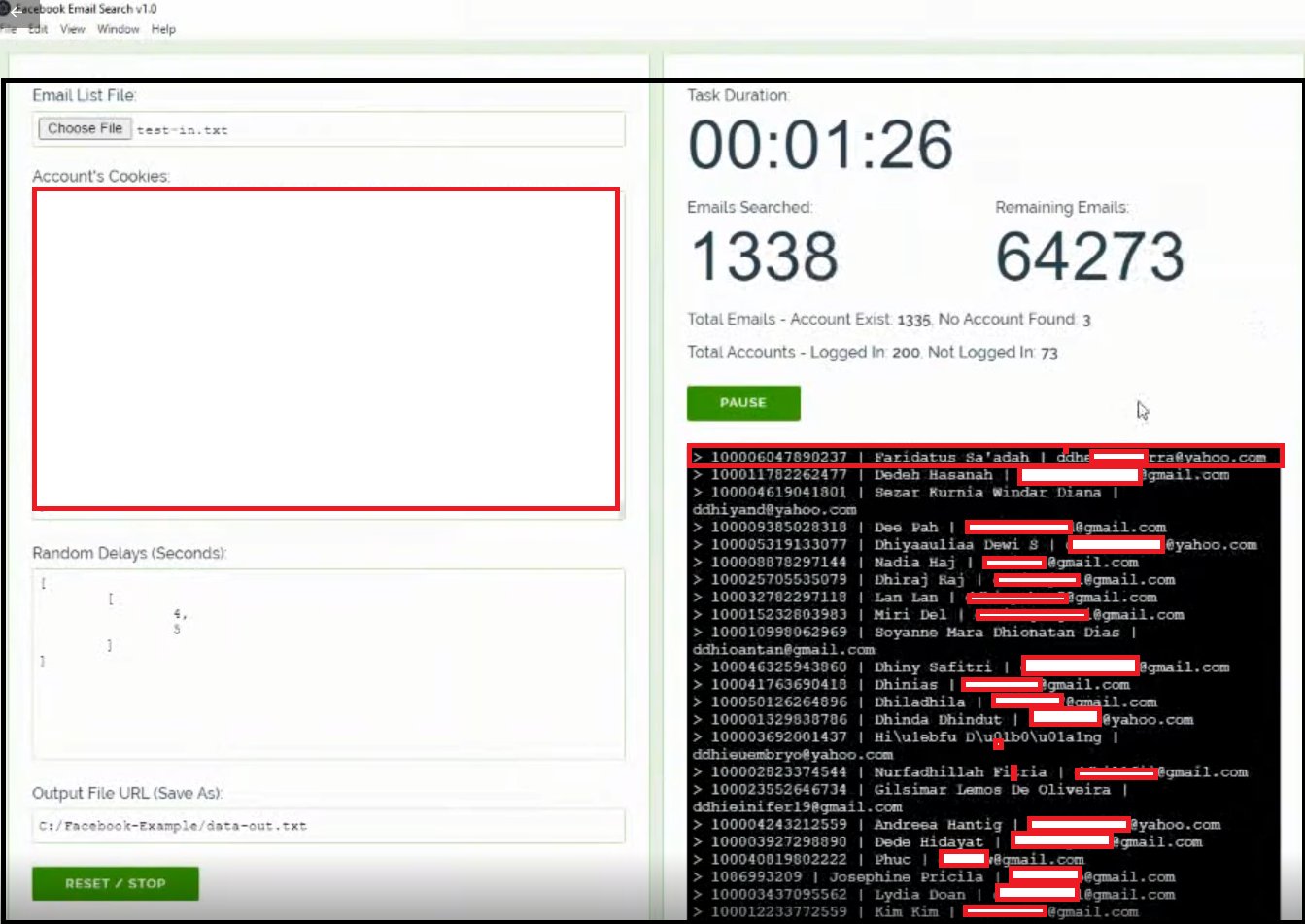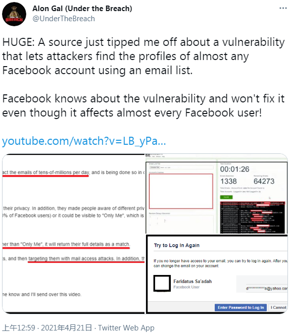 尽管 Facebook 从未公开披露过用户的注册邮件地址,但由技术专家 Ashkan Soltani 和网络安全情报公司 Hudson Rock 联合创始人兼 CTO Alon Gal 在 Twitter 上的爆料可知,已经有相关黑产工具来批量关联用户的 Facebook 账户和电子邮件地址。推文中随附的三张截图、以及时长 20 秒的 YouTube 视频片段表明,这款工具的功能和效率让我们感到深深不安。