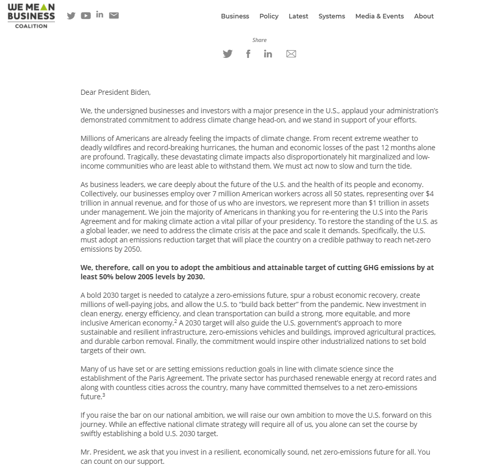 这些公司表示,在美国努力减排50%的同时,拜登也应该让美国在2050年之前走上碳中和的道路。公开信中指出:“为了恢复美国作为全球领导者的地位,我们需要以它所要求的速度和规模解决气候危机。具体而言,美国必须通过一个减排目标,使国家走上一条可信的道路,到2050年达到净零排放。"