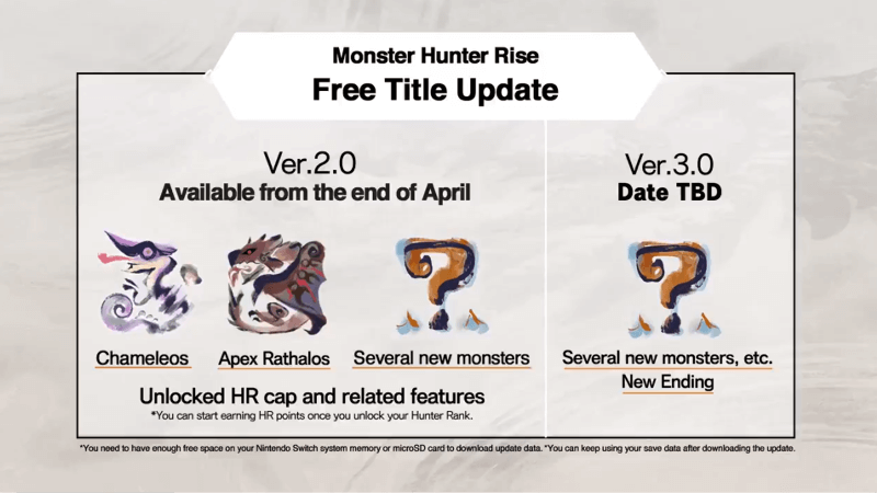 《怪物猎人:崛起》2.0版本更新包括之前已公布的炎妃龙,霸主火龙等新怪物;此次更新预热直播还将公布除此之外的更多游戏内容。