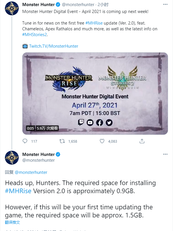 怪物猎人官方推特于今日发文,宣布《怪物猎人》线上发布会将于4月27日晚22点举办(北京时间),届时将公布《怪物猎人:崛起》首个大更新2.0版本的详情以及《怪物猎人物语2毁灭之翼》的最新情报。