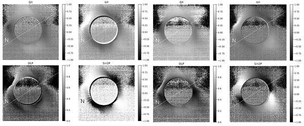 针对上述问题,研究人员将盲退卷积和噪声自适应模糊均衡算法应用于日冕红线图像的增强中,结合CC算法,最终取得较高精度的日冕图像配准结果。通过日冕偏振图像的配准结果,研究人员获取了高精度的成像偏振信息。如图2所示,左侧四幅子图显示的是传统CC算法配准后的解调结果,在月亮边缘处表现出明显的跳跃,偏振的方位角信息Sin 2P也表现出一些细节特征,这些都是异常的,原因是此次日全食的遮挡率是1.0306,而月亮边缘的偏移量已超出了该范围,故CC算法配准的结果明显不可靠。相对而言,研究人员提出的配准算法获得了较好的配准结果。