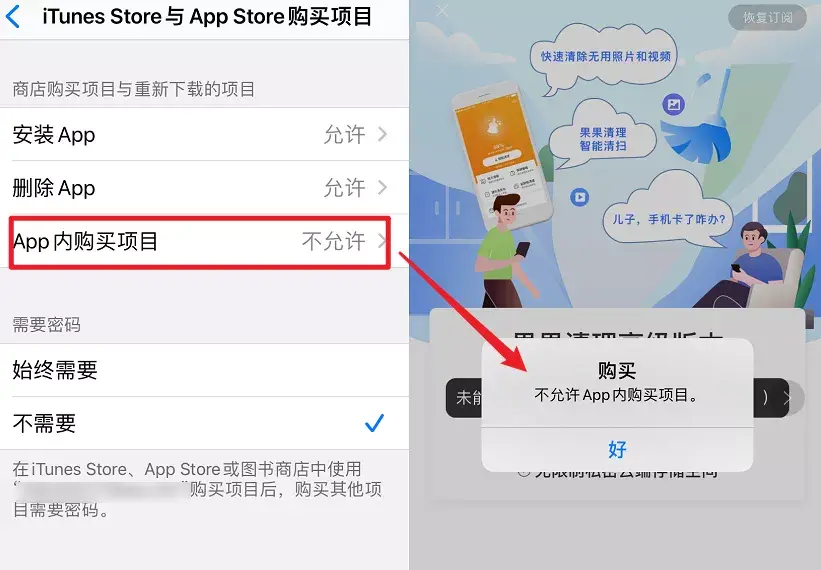 把 “ 设置 - 屏幕使用时间 - 内容和隐私访问限制 -iTunes Store 与 App Store 购买项目 -App 内购买项目 ” 设置为不允许之后所有付费项目都会被禁止。