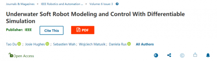 2021 年 3 月 31 日,相关研究成果发表于 IEEE RA-L 期刊,题为 Underwater Soft Robot Modeling and Control With Differentiable Simulation(基于可差分模拟的水下机器人建模与控制)。