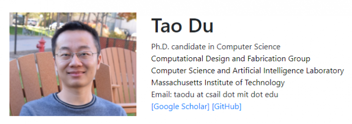 如上文所述,这一设计来自于 MIT CSAIL。一位名为 Tao Du 的团队成员是该论文共同一作,此次主导了“派大星”的软硬件开发。Tao Du 本科毕业于清华大学软件学院,随后在斯坦福大学计算机读硕士,目前 MIT 博士在读,研究方向是计算机图形学、机器人学和机器学习,关注复杂物理系统中具有挑战性的设计和控制问题。