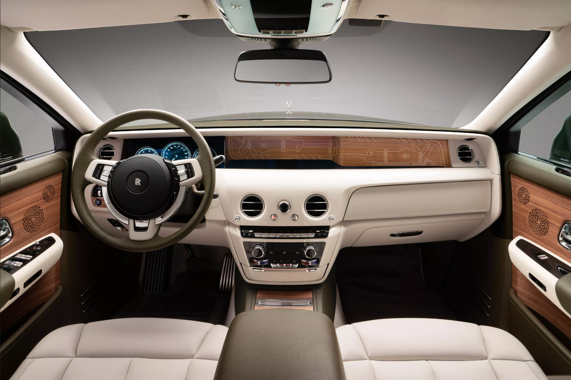 跟任何一款劳斯莱斯一样,当走进车内之后真正的戏剧性才会到来。这不仅仅是一辆带有爱马仕徽章和特殊皮革的汽车--劳斯莱斯表示,这是一次“深入、真诚”的合作,它的工匠和设计师跟爱马仕携手合作。几乎每一个表面都覆盖在Hermès Enea绿色皮革。除了座椅、门板和仪表板,绿色皮革还出现在立柱移位器、气候控制旋钮和车门拉手等触点上。另外,它还会被用到人们通常看不到或摸不到的地方如香槟冷却器、行李架、手套盒和行李箱内衬等。