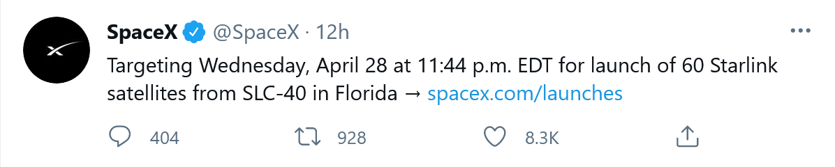 星链的上一次发射在4月7日,但在这之后的几周里,SpaceX一直在忙碌着其他任务。上周,宇航员搭乘载人龙飞船飞往国际空间站,另外还有消息称,NASA计划通过Artemis项目选择让星际飞船(Starship)登陆月球表面。