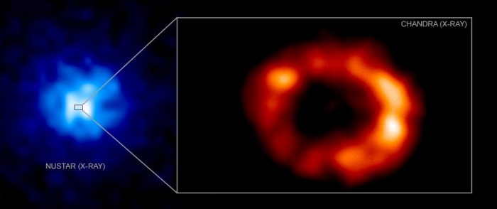 通过钱德拉和NuSTAR,研究小组发现SN 1987A的碎片撞向周围物质时产生了相对低能量的X射线。研究小组还利用NuSTAR探测更高能量X射线的能力发现了高能量粒子的证据。对这种高能X射线发射有两种可能的解释:要么是脉冲星风星云,要么是粒子被爆炸的冲击波加速到高能。后一种效应不需要脉冲星的存在,而且发生在离爆炸中心更远的地方。