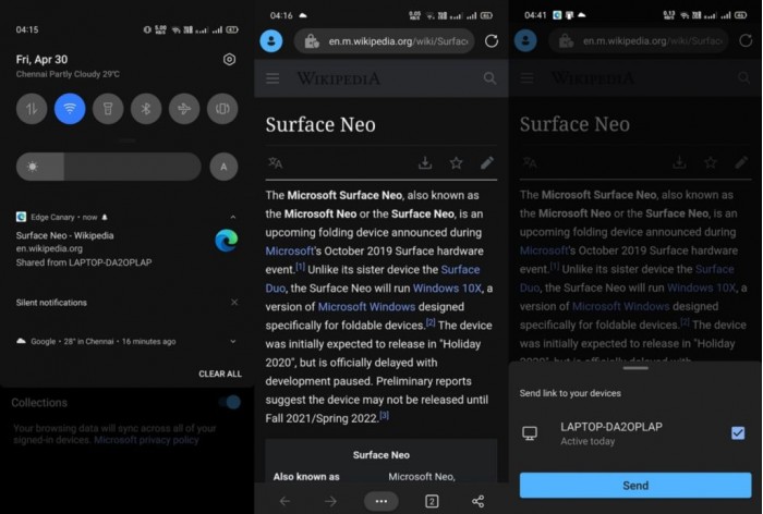 基于 Chromium 的 Edge Canary 频道版本近日获得“发送至我的设备”功能,能够在 PC 和 Android 手机端的 Edge 浏览器中互相发送标签页。该功能于 2019 年已经引入到 Chrome 浏览器中,基本上允许用户向其他设备分享页面。