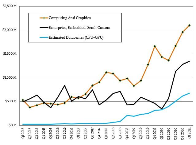 本季度,AMD计算与图形部门的销售额为21亿美元,增长46%,营业收入为4.85亿美元,增长85.1%。企业、嵌入式和半定制业务增长了3.9倍,达到13.5亿美元,这主要归功于Eypc CPU的销售强劲,同时还有一些Instinct GPU的销售(笔者认为同比下降)和游戏机芯片的销售(笔者认为这下降了一点)。