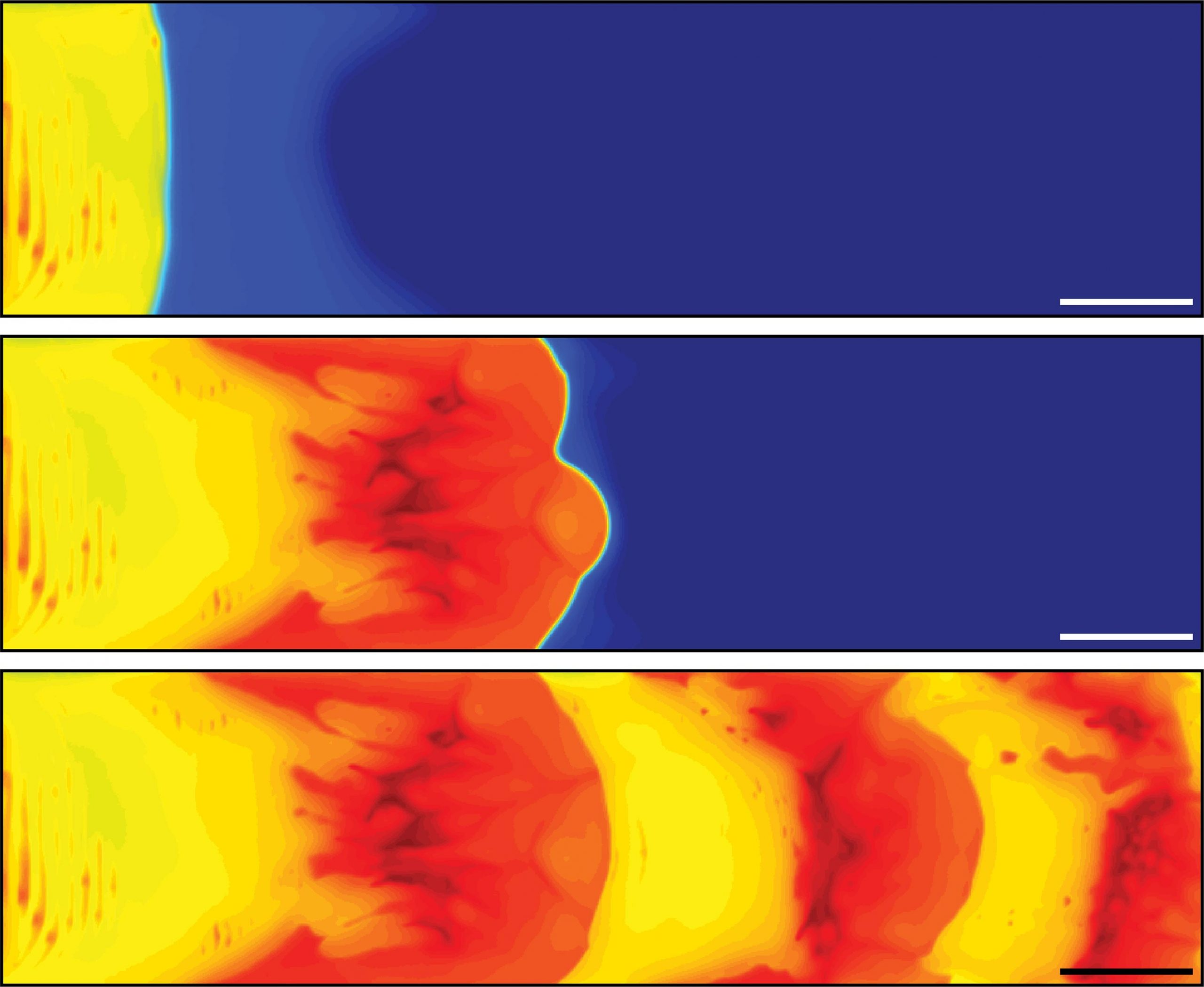 该小组将双环戊二烯单体的溶液放在一个通道中,然后加热通道的一端。热量激活了钌催化剂,导致单体聚合,产生更多的热量,沿着通道向下流动。这种情况持续发生,直到该区域所有可用的单体都被消耗掉。最终,热量沿着通道向更远的地方移动,到达一个有新鲜单体存在的地方,这个过程又开始了。通过这种技术,研究小组产生了具有规则脊的树脂,他们通过调整溶液的初始温度来控制脊的高度和间距。通过使用不同的单体或向溶液中添加其他化合物,研究人员创造了具有颜色和硬度模式的材料。研究人员说,这种新方法有朝一日可以用来创造各种新的 "智能 "材料,从轮胎或鞋子的胎面到电子和生物材料。