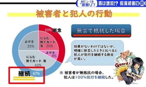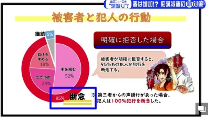 ·根据警方的统计,发生在电车内的痴汉行为如果单纯是受害者沉默无语的低调反抗的话,其侵害行为有67%的比例仍然会继续,然而如果有“第三者”的发声或者行动阻止的话,100%的痴汉行为都会终止。