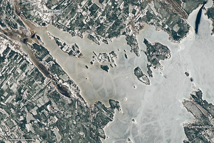 图图像显示,大量的冰仍然附着在瑞典的海岸上。这种 "陆地快速冰"被固定在岸边,不会漂移。在海湾的更远处,漂流冰随着风或水流自由移动。