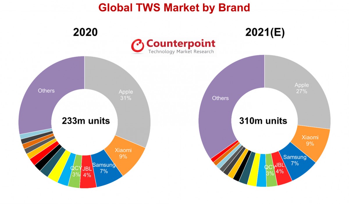 过去几年看到的真无线立体声(TWS)耳机的产销热潮预计今年还会持续。根据Counterpoint Research的最新报告,预料2021年TWS耳机的出货量约为3.1亿部,与2020年的2.33亿部相比增长33%,苹果、小米和三星预计仍将是该领域的三大玩家。