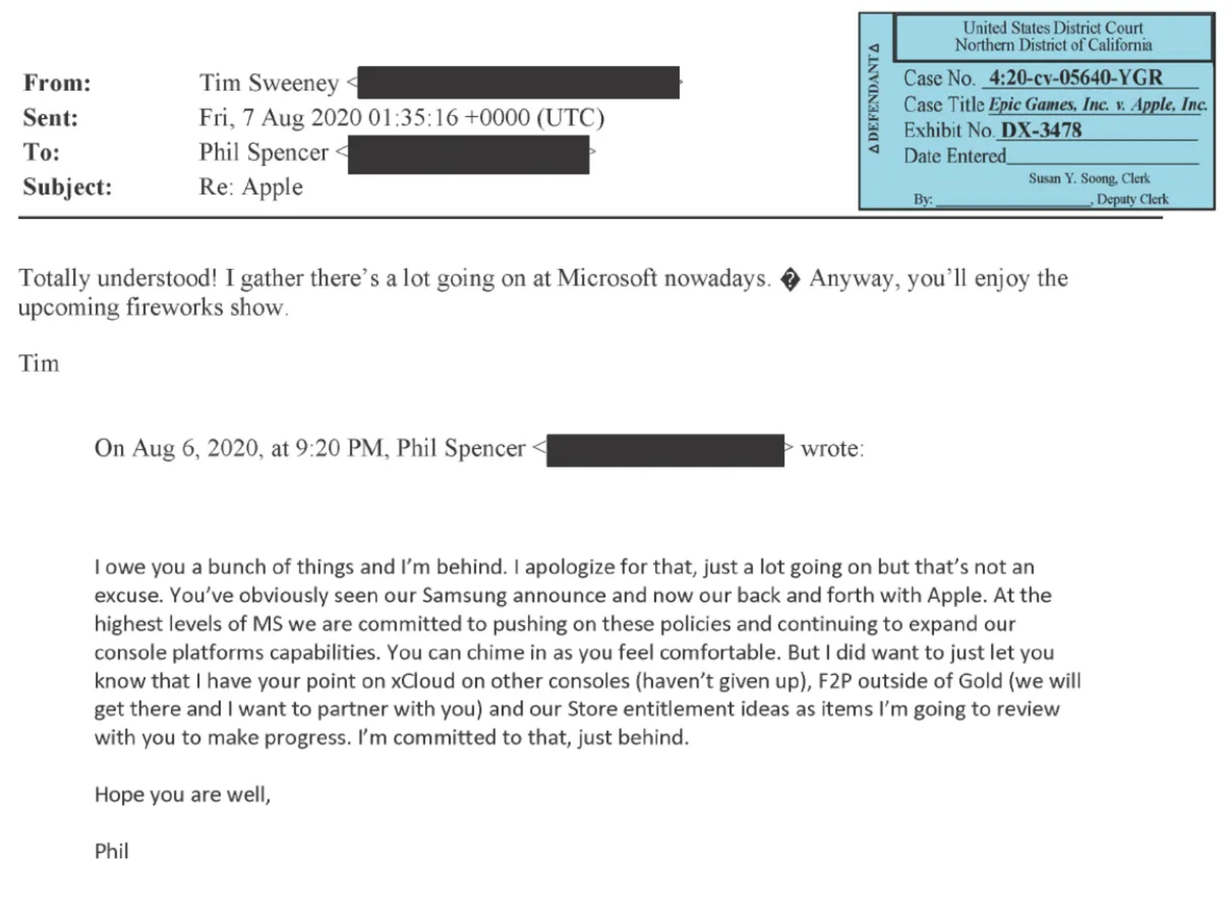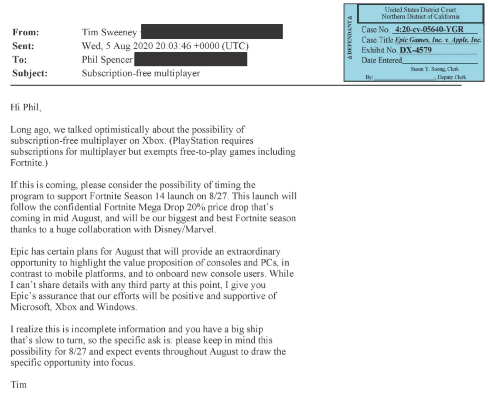 Sweeney在邮件中写道:“Epic在8月份有一些计划,这将提供一个跟手机平台和主机新用户相比突出主机和PC价值主张的绝佳机会、虽然我现在不能跟任何第三方分享细节,但我可以向你们保证,我们的努力将是积极的并支持微软、Xbox和Windows。”