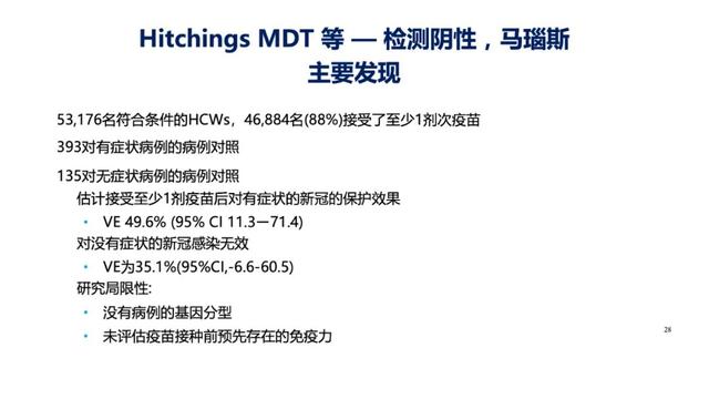 研究结果显示:接受至少1剂疫苗后对有症状的新冠的保护效果为49.6% (95% CI 11.3ー71.4)。