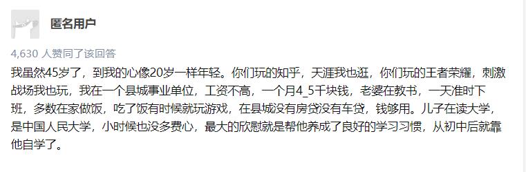 朴素的回答中透露着答主对生活的知足,而游戏则为其中增添了不少色彩。但有时候,境遇的不同往往会会带来认知上的偏差,尤其是在40岁这个人生关键的阶段,其中的辛酸其他人很难有深切体会。