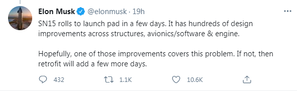 SN15 将在几天内运到测试台。它在结构、航空电子/软件和引擎等方面的设计上有数百处改进。希望这些改进能解决问题,要是解决不了,那就多花几天时间再改装。