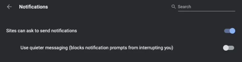 在这里用户可以禁用“网站可以要求向你发送通知”来完全关闭通知提示。你还可以切换“使用更安静的消息”选项,这将使通知在仅在 Chrome 中执行任务时不会出现。