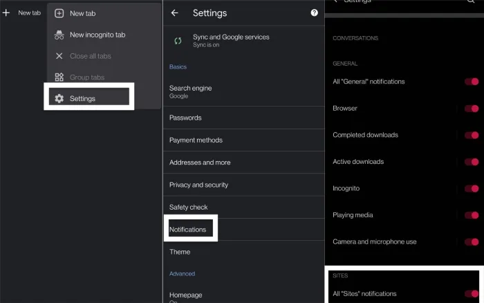如果你之前启用了通知功能,你也可以使用这个页面单独禁用任何网站的通知功能。向下滚动挑选一个网站,然后点击页面右侧的三点式选项菜单。Android 上的处理略有不同。只需前往Chrome浏览器>设置>通知,然后切换关闭每个网站的通知或所有网站通知的切换。虽然你仍然会看到提示,但至少,它不会发出通知。