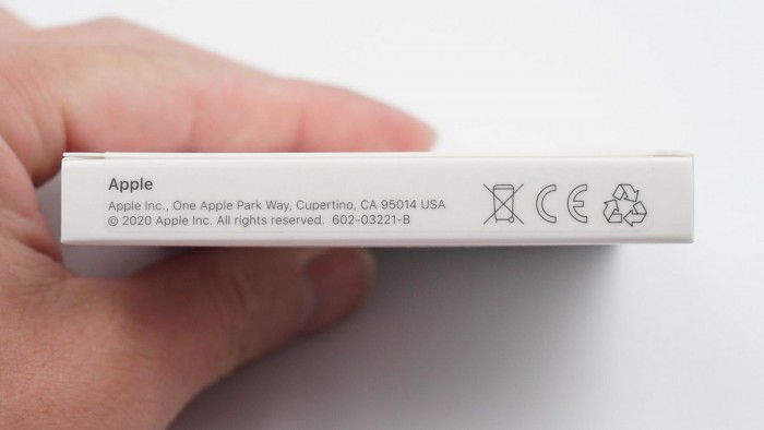 包装盒侧边的苹果版权声明,我们拆解的这款是2020年的。