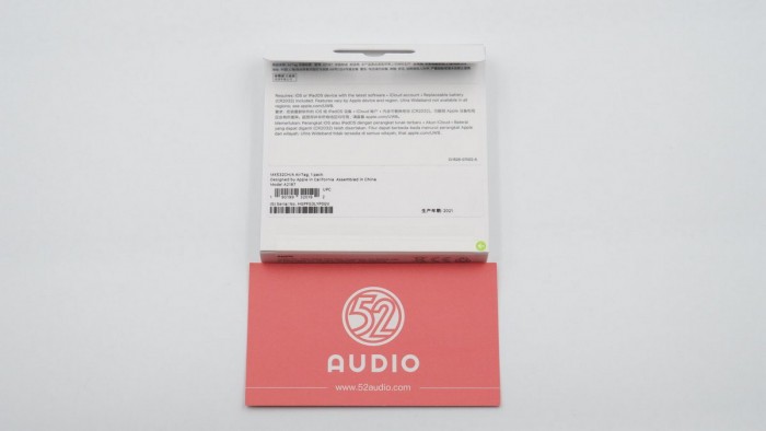 包装盒比较扁平,非常小巧,正面印有“AirTag”产品名和外观渲染图。