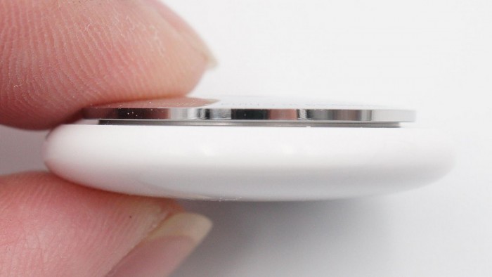 AirTag侧面展示,凸起设计可以容纳容量更大的电池,也便于安装固定到挂钩等配件上。