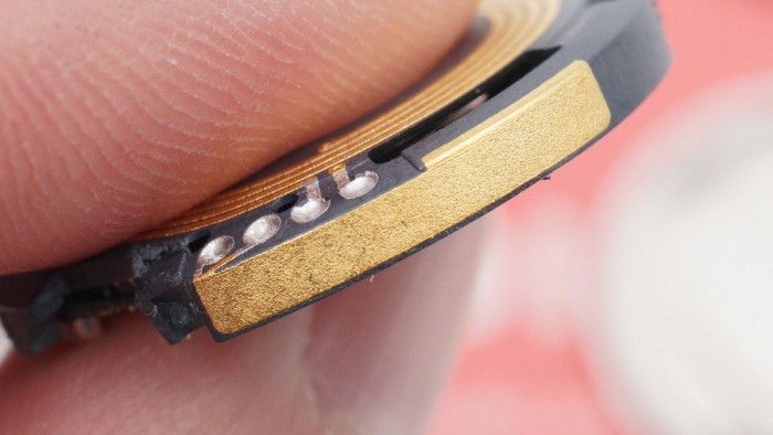 加热后取下壳体,看到AirTag的内部结构,电池负极触点两侧的焊盘是内部线圈的焊点。