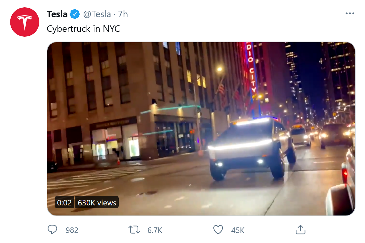 这款造型超前、随时准备迎接世界末日的电动皮卡在2019年的一次演示中出现了错误,周六特斯拉在Twitter上发布了一段视频。这段简短的视频展示了这款车驶过Radio City Music Hal的画面。