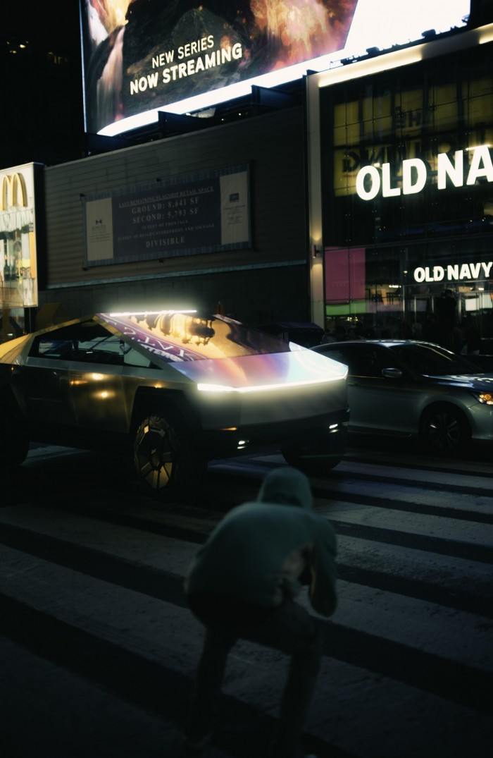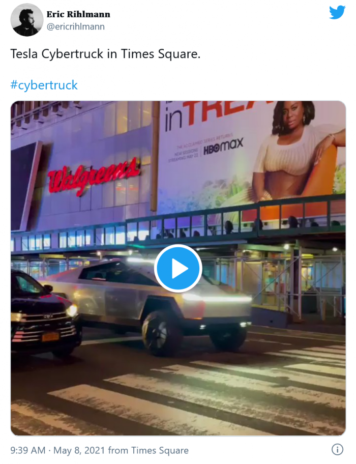 Twitter用户Eric Rihlmann也在Twitter上发布了Cybertruck的视频并发布了一张周五晚上该车穿过时代广场的静止图片,同时还评论了他在目睹这一奇观时感受到--“银翼杀手的感觉”。