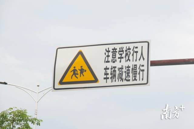 事发路段附近有学校,路边有多个安全提示标识。