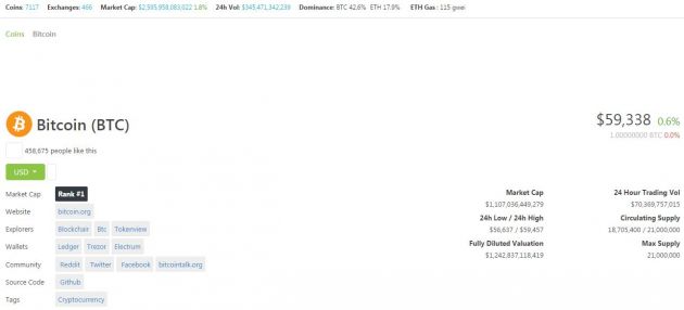 比特币市值在加密货币总市值中的占比再创新低,已跌至42.6%。截至发稿,Coingecko网站的数据显示,比特币价格突破59000美元,市值约为1.11万亿美元,而加密货币总市值约为2.6万亿美元,比特币市值在加密货币总市值中的占比为42.6%。