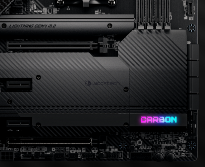 上图中展示的 X570S Carbon 新品,也迎来了外观上的全面大修。除了无风扇的 PCH,可预期它的供电(VRM)和 I/O 选项也会在 X570 Carbon 的基础上有所改进。