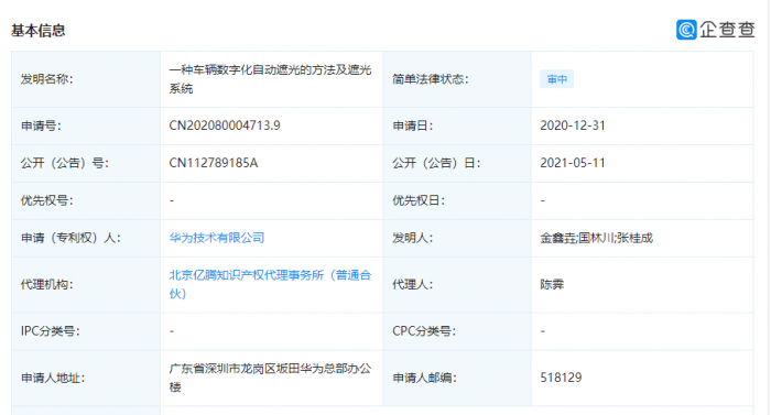 华为此前曾多次重申公司策略不变:华为不造车,聚焦ICT技术,做智能汽车增量部件供应商,帮助车企造好车。今日,从企查查网站了解到,华为技术有限公司公开了一项“一种车辆数字化自动遮光的方法及遮光系统”专利,申请日为2020年12月31日,公开号为CN112789185A,公开日为5月11日。